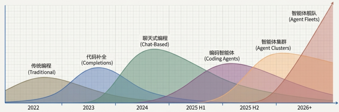 现在,结合全知全能的大模型像打开了盒子,AI 的介入让软件工程快速进入了"意图驱动"的时代。 我们正处在软件工程史上最剧烈的变革期------从"人写代码给机器看" 转向"人表达意图给AI听,AI实现给机器看"。