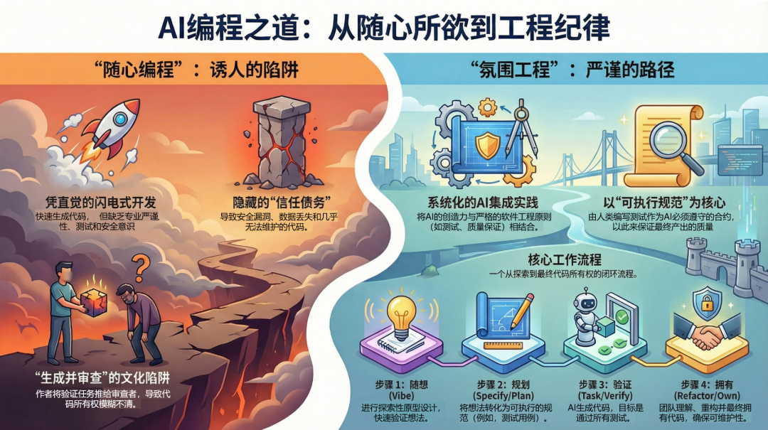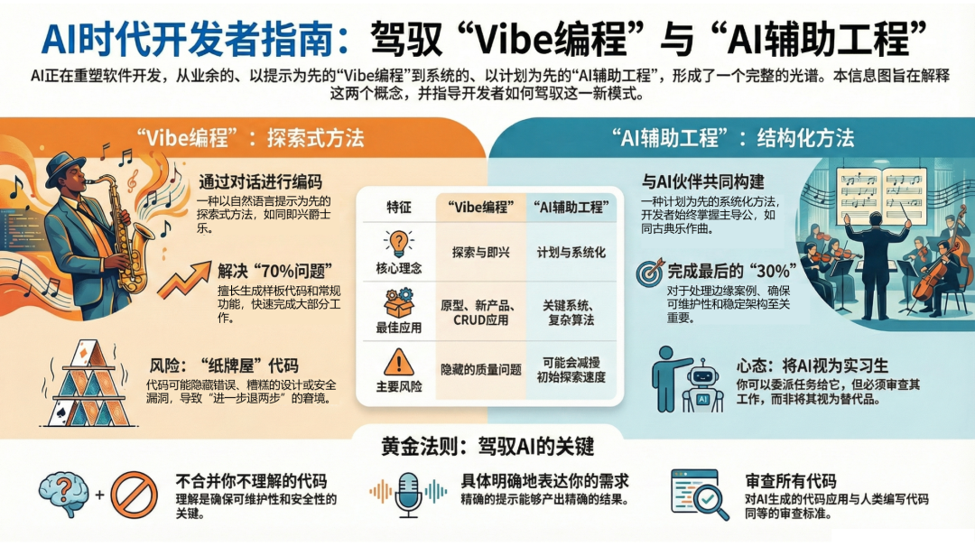 工程化转型(2026): 随着企业发现纯粹的"氛围感"会导致难以维护的代码,社区开始将其规范化,形成了 **Vibe Engineering------即在保持AI高效协作的同时,加入架构守卫和规范约束。
