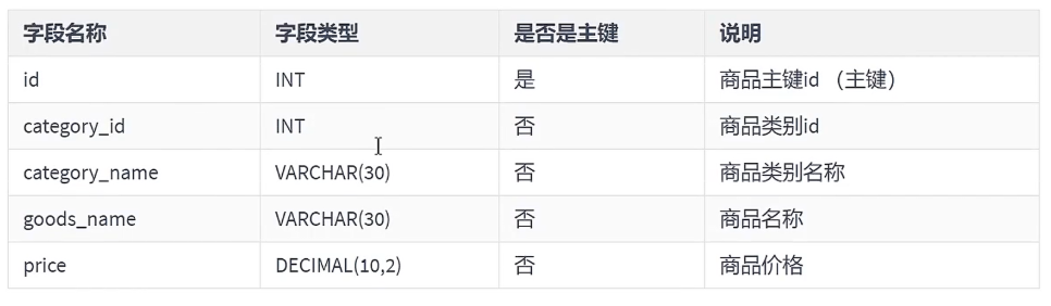 表1:商品主键id-商品名称-商品价格-商品类别id