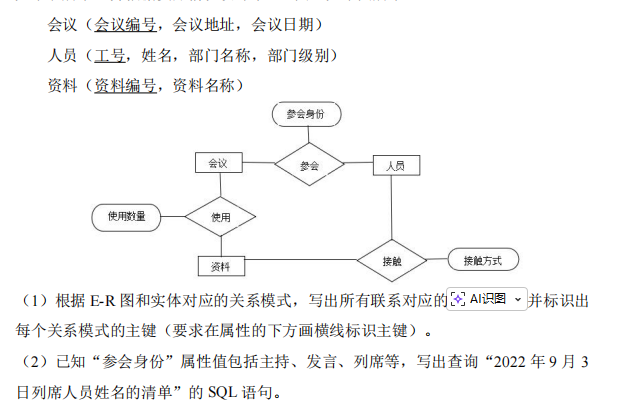 补全关系模式 参会(会议编号,工号,参会身份);使用(会议编号,资料编号,使用数量);接触(工号,资料编号,接触方式)