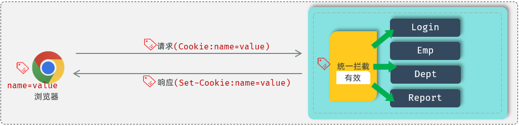 会话技术:用户登录成功之后,在后续的每一次请求中,都可以获取到该标记。