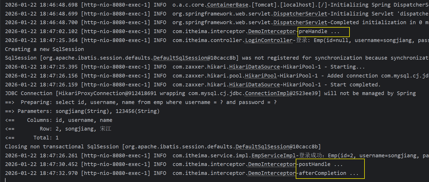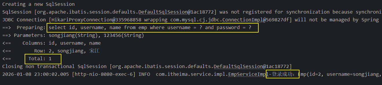 @Select("select id, username, name from emp where username = #{username} and password = #{password}")