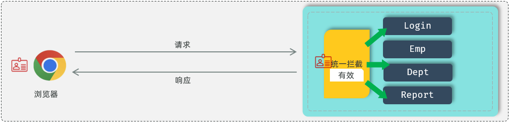 在浏览器发起请求时,需要在服务端进行统一拦截 ,拦截后进行登录校验。
