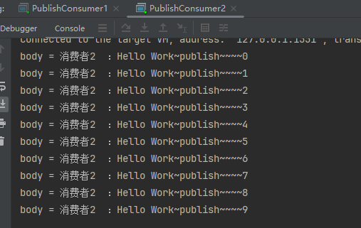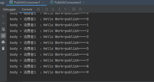 javapackage cc.wj.test.rabbitmq.learn.publish; import cc.wj.test.rabbitmq.learn.MqConst; import com.rabbitmq.client.BuiltinExchangeType; import com.rabbitmq.client.Channel; import com.rabbitmq.client.Connection; import com.rabbitmq.client.ConnectionFactory; import static cc.wj.test.rabbitmq.learn.MqConst.EXCHANGE_NAME_PUBLISH; /** * 简单模式 * * @author wj * @version 1.0 * @date 2026/1/21 16:11 */ public class PublishProducer { public static void main(String[] args) throws Exception { // 1. 创建连接工厂以及参数配置 ConnectionFactory factory = new ConnectionFactory(); factory.setHost("192.168.146.130"); factory.setPort(5672); factory.setVirtualHost("/"); factory.setUsername("guest"); factory.setPassword("guest"); // 2. 创建连接Connection Connection connection = factory.newConnection(); // 3. 创建管道Channel Channel channel = connection.createChannel(); // 创建交换机 /** * exchange: 交换机名称 * type: 交换机类型 * FANOUT("fanout"): 广播模式,把消息发送给所有绑定的队列 * DIRECT("direct"): 定向投递,把消息发送给指定的`routing key`的队列 * TOPIC("topic"): 通配符模式,把消息交给符合`routing pattern`的队列 * HEADERS("headers"): 使用率不多,参数匹配 * durable: 是否持久化 * autoDelete: 是否自动删除 * internal: 内部意思,true:表示当前Exchange是RabbitMQ内部使用,用户创建的队列不会消费该类型交换机下的消息,所以我们自己使用设置为false即可 * arguments: 参数 */ channel.exchangeDeclare(EXCHANGE_NAME_PUBLISH, BuiltinExchangeType.FANOUT, true, false, false, null); // 4. 创建队列Queue /** * queue: 队列名 * durable: 是否持久化,true:重启后,队列依然存在,否则不存在 * exclusive: 是否独占,true:只能有一个消费者监听这个队列,一般设置为false * autoDelete: 是否自动删除,true:当没有消费者的时候,自动删除队列 * arguments: map类型其他参数 */ channel.queueDeclare(MqConst.QUEUE_NAME_PUBLISH1, true, false, false, null); channel.queueDeclare(MqConst.QUEUE_NAME_PUBLISH2, true, false, false, null); // 绑定交换机和队列 /** * queue * exchange * routingKey: 路由key,绑定规则,这里暂不使用(fanout本身广播给所有订阅者,所以没有路由规则,使用空字符串即可) */ channel.queueBind(MqConst.QUEUE_NAME_PUBLISH1, EXCHANGE_NAME_PUBLISH, ""); channel.queueBind(MqConst.QUEUE_NAME_PUBLISH2, EXCHANGE_NAME_PUBLISH, ""); // 5. 向队列发送消息 /** * exchange: 交换机名称,简单模式没有,直接设置为 "" * routingKey: 路由key,映射路径,如果交换机是默认"",则路由key和队列名一致 * props: 配置信息 * body: 消息数据 */ for (int i = 0; i < 20; i++) { String msg = "Hello Work~" + i; channel.basicPublish(EXCHANGE_NAME_PUBLISH, "", null, msg.getBytes()); } // 7. 释放 channel.close(); connection.close(); } }消费者: