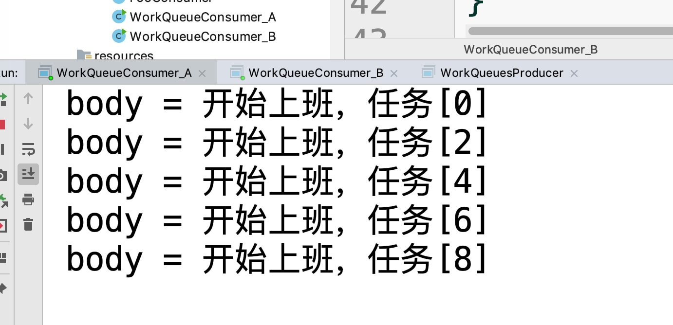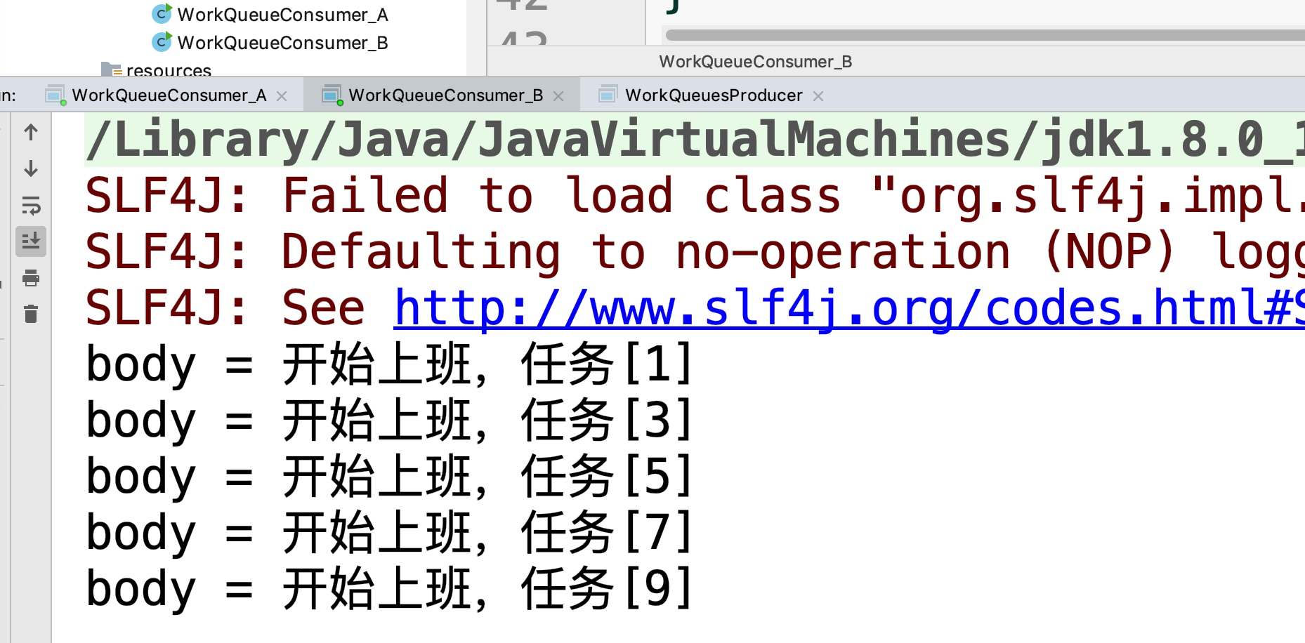 如果任务量很大很多,而一个消费者处理不过来,则此时可以使用工作队列,比如短信发送在一个系统里会有很多场景进行发送给用户,所以量很大的时候,也可以分配给多个消费者去进行消费发短信即可。这就像上班工作量很大,就需要招人共同完成一些任务是一个道理。