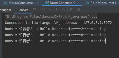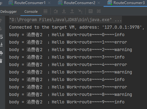 channel.basicPublish(EXCHANGE_NAME_ROUTE, logArr[i % 3], null, msg.getBytes());