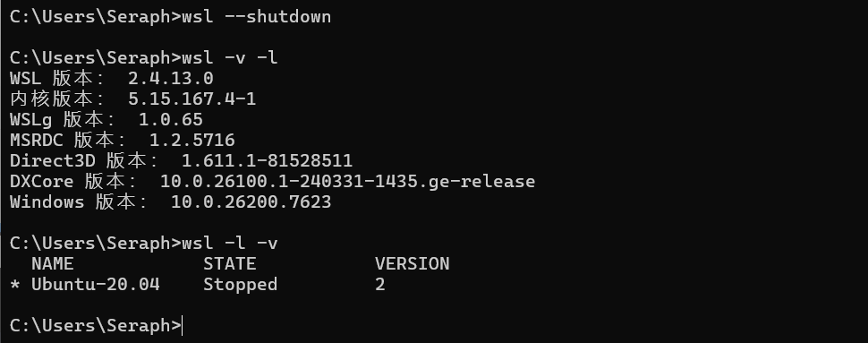ctrl +d 退出 WSL 后输入如下命令,也可在新的 powershell 窗口中输入如下命令。