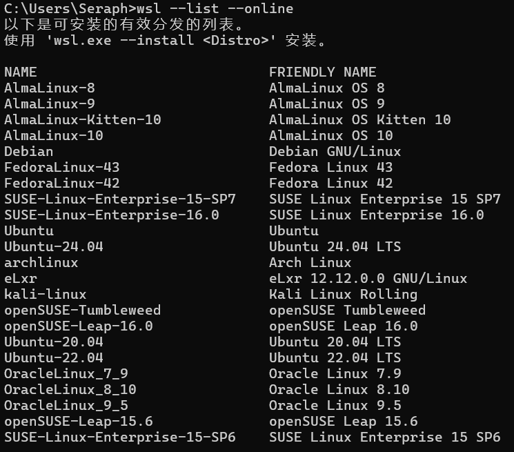 wsl --list --online # 或 wsl -l -o