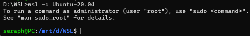 运行以上命令,将 Ubuntu-20.04 重新导入到 D:\WSL\Ubuntu-20.04(注意目录)。