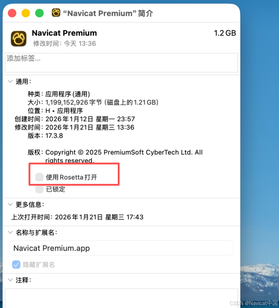 1、若不勾选 "使用 Rosetta 打开",代表 Navicat 通过原生运行。