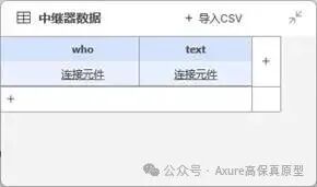 中继器表格里添加两列,who列用来确认是谁说的话,我们定义如果who列的值等于我,那该行内容就是我说的,如果who列的值不等于我,那就是机器人说的。Text列对应具体说的内容。中继器表格里默认为空,如果你想默认展示以前的聊天记录也可以在中继器表格里填写。