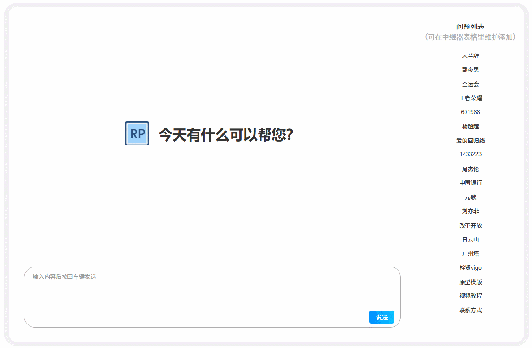 本原型模版主要分成底部背景、欢迎区域、问题列表、对话区域输入区域