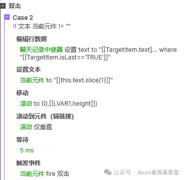 考虑到内容较多时,我们先把最新的内容显示出来,所以我们需要动态面板的滚动条滚动到最下方,这里我们需要在对话记录的动态面板内添加一个默认隐藏的元件作为锚点。然后用移动的交互,移动到对话记录中继器的底部,最后用滚动到元件的交互,让动态面板的滚动条滚动到底部元件的位置。