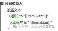 如果是Axure10或以上的版本,我们点击表格里的连接元件,选择中继器里的矩形和文本标签,就可以将问题设置到矩形,将答案设置到文本标签;如果是Axure9或以下的版本,就要在中继器每项加载时,通过设置文本的交互,将wenti列和答案列的值设置到对应的元件里。