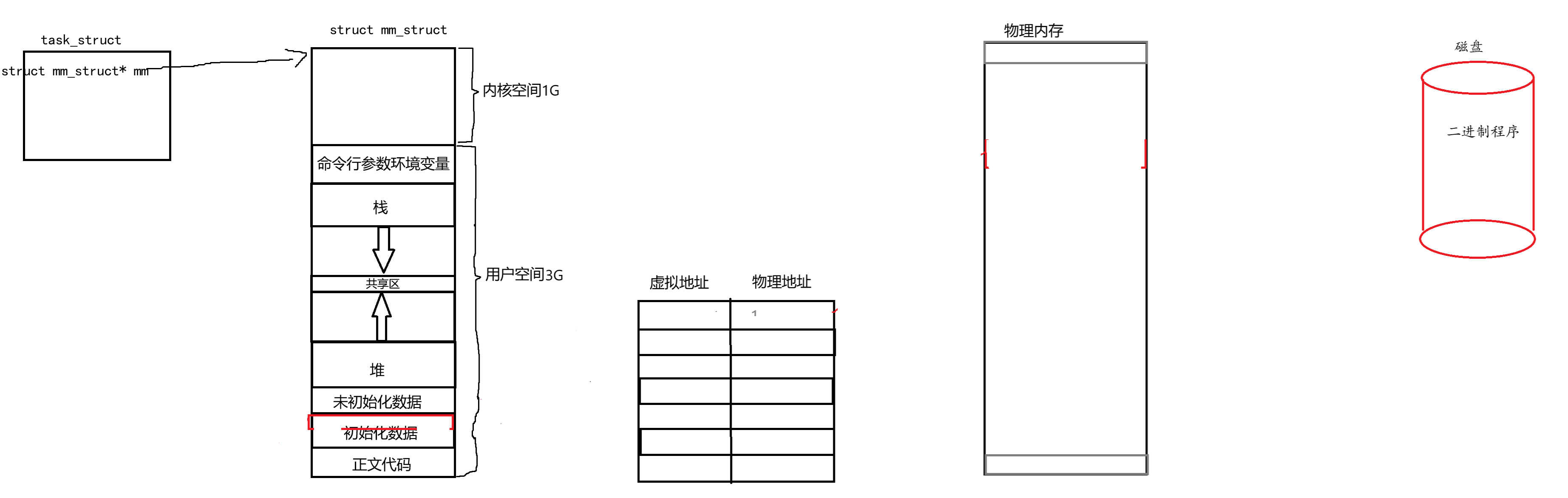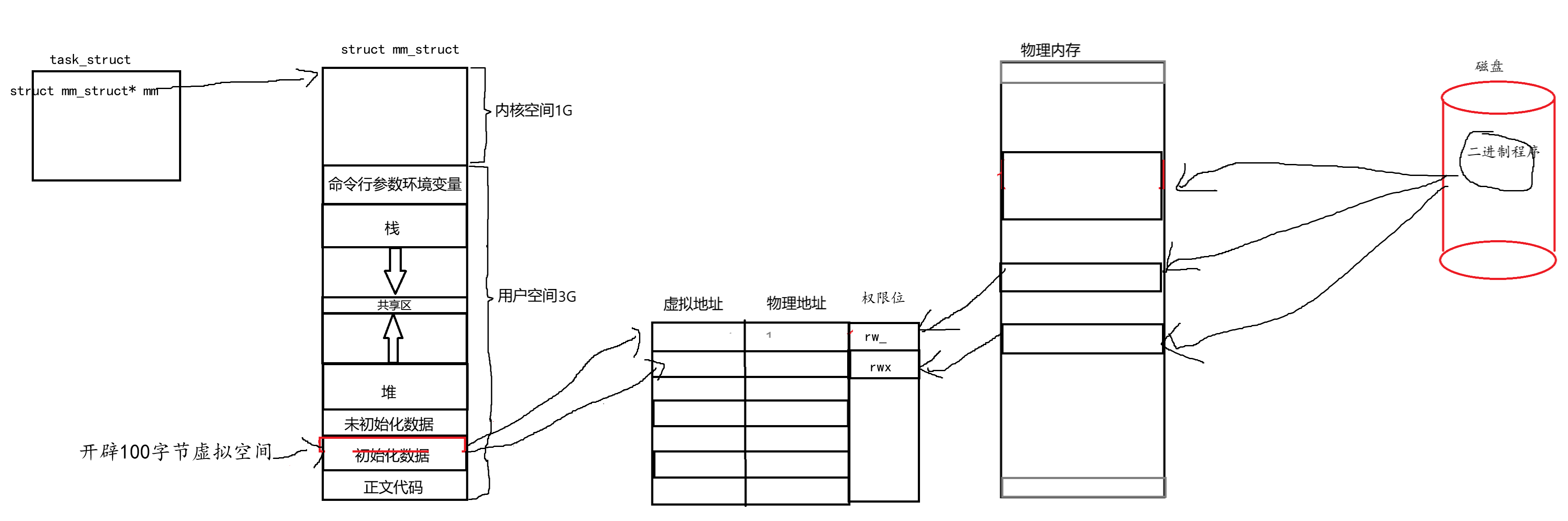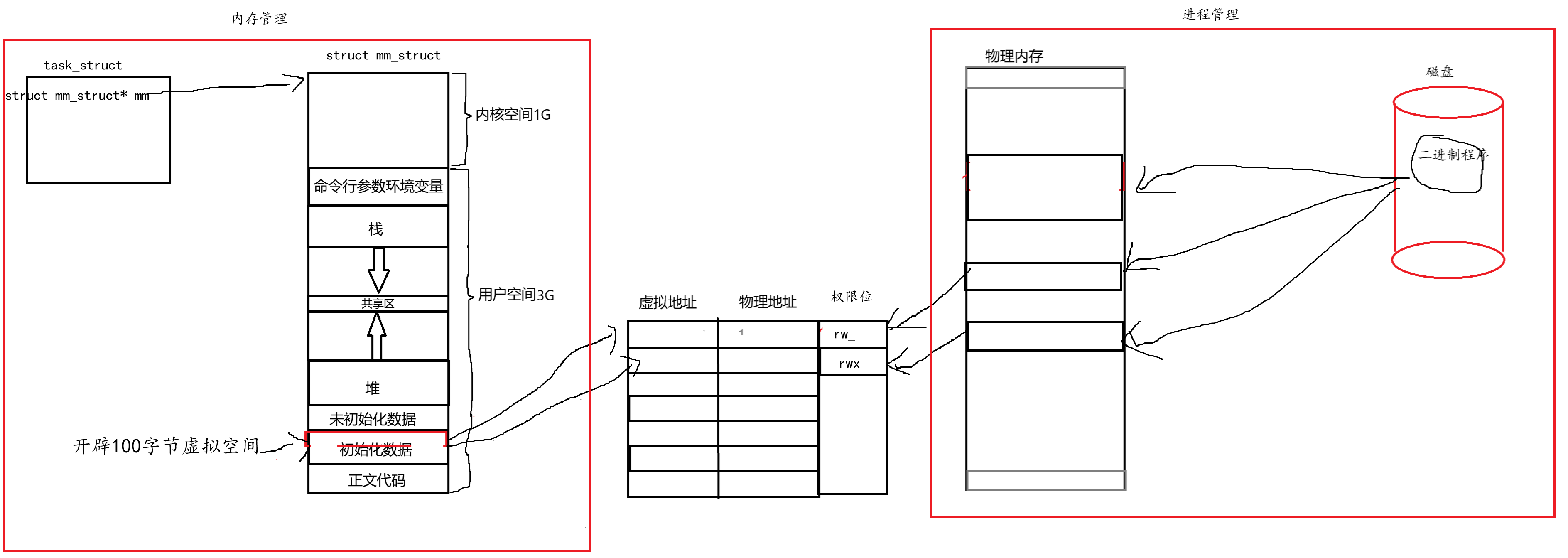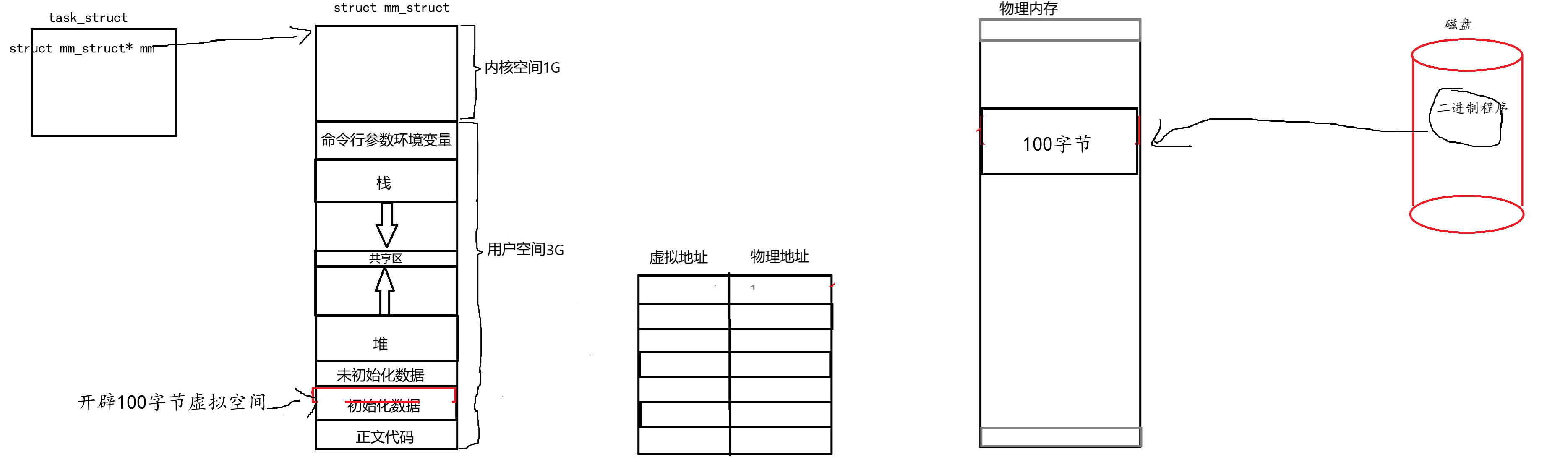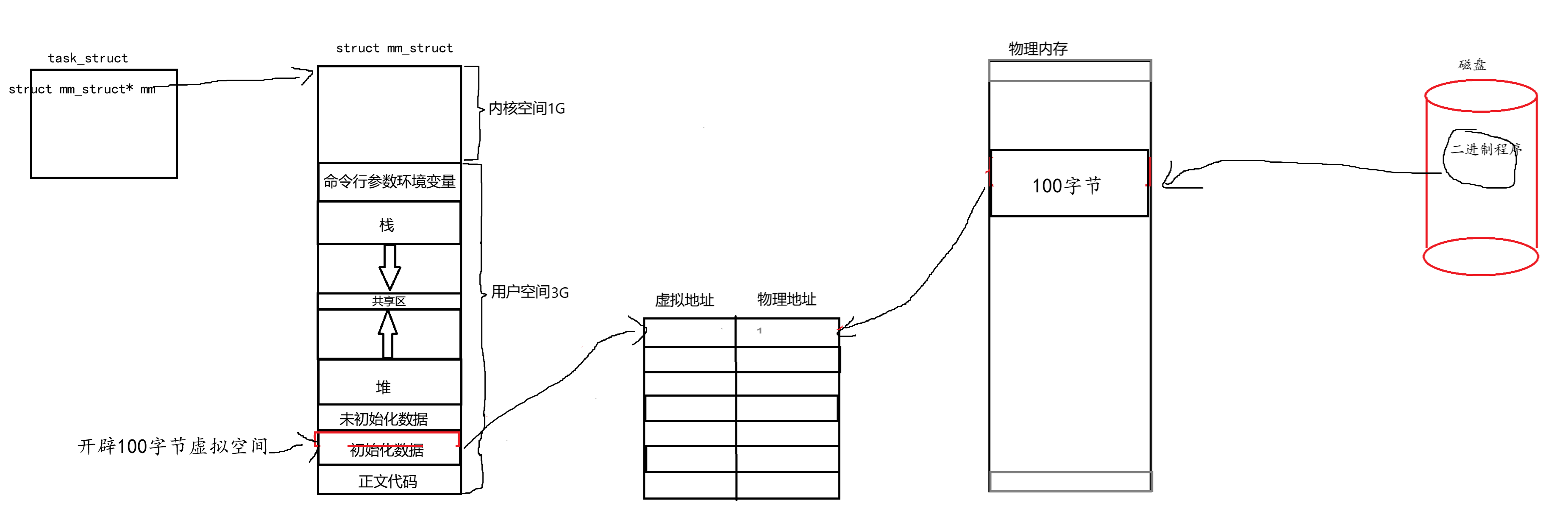 进程创建时系统会给进程申请一个task_struct,在这个过程中,系统会读取文件的格式信息来了解要代码和数据的大致信息,然后在虚拟地址中开辟空间,比如代码的大小为100字节,操作系统就会为代码在虚拟内存中开辟相应100个字节。然后操作系统会为代码和数据开辟100个字节的物理内存,将代码和数据加载到物理内存。