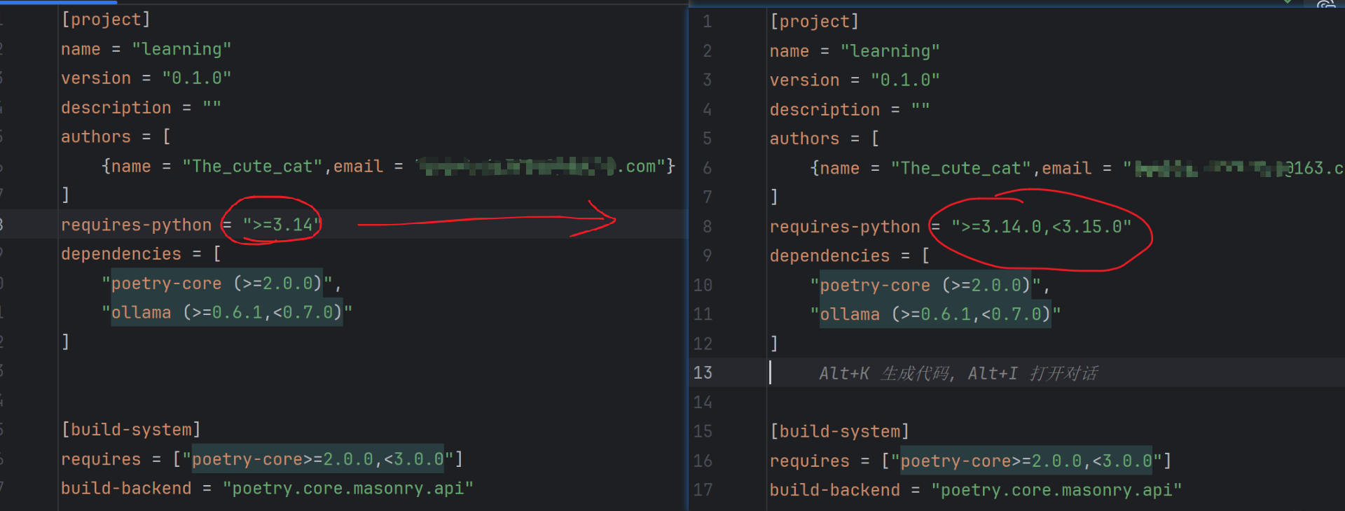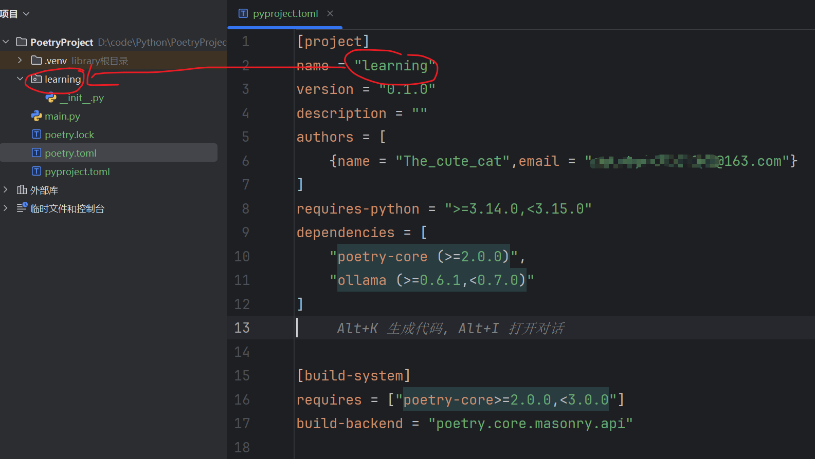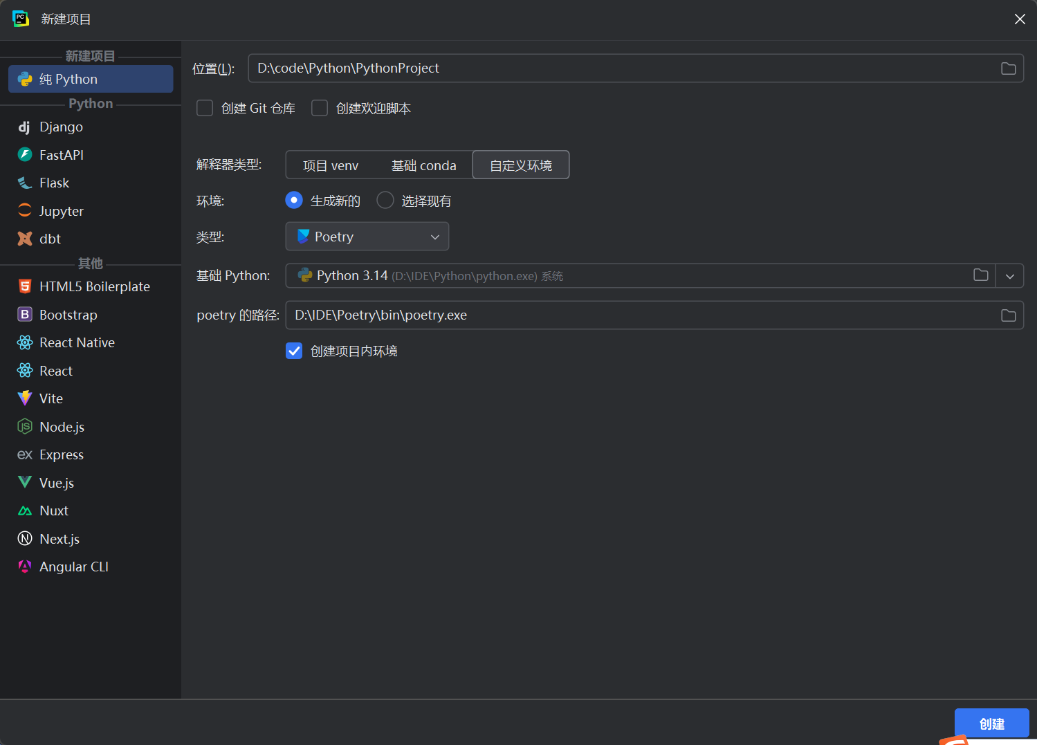 使用如下界面创建项目后,来到poetry.toml文件修改Python版本