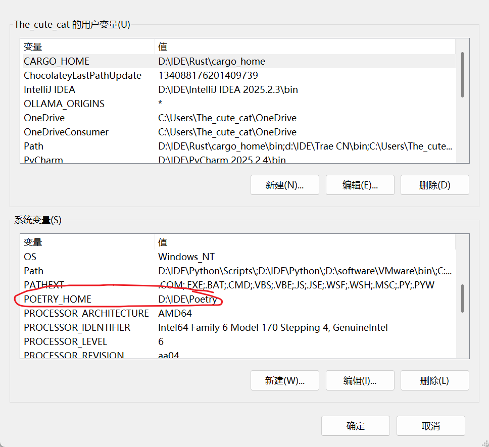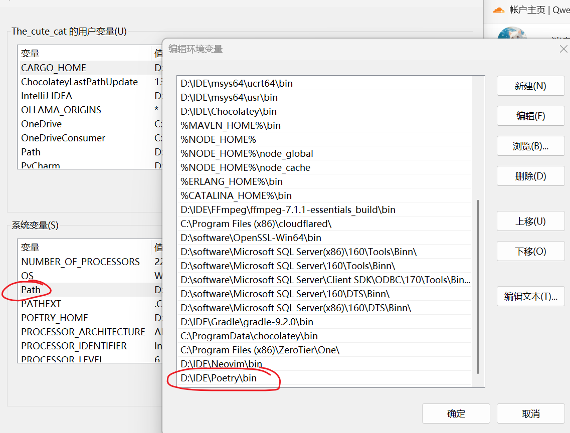 如果显示找不到poetry指令就去把你的poetry安装路径添加到系统的Path变量,然后重启终端: