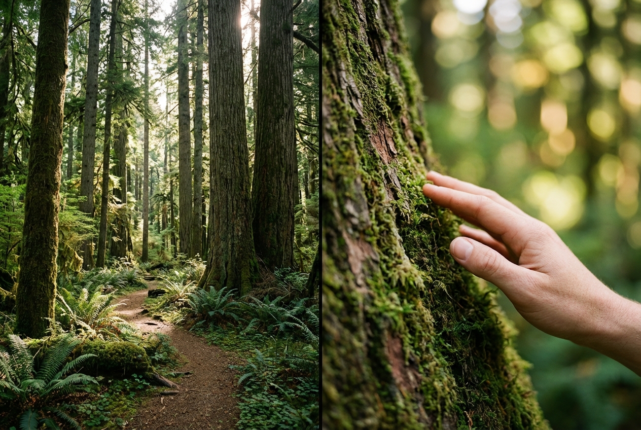 ![示例图:对比图------左侧为"广角森林全景",右侧为同一场景下的"手部特写与背景虚化"效果]