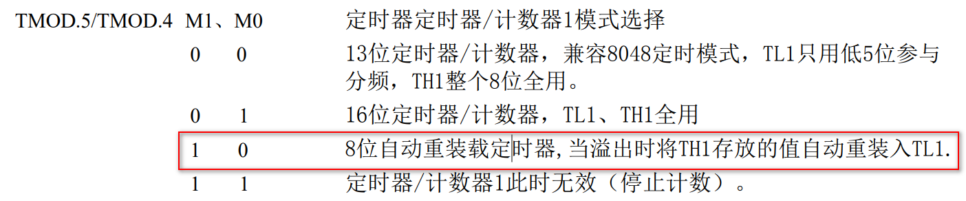 TMOD &= 0X0F;//将定时器1的寄存器(BIT4-BIT7)复位 TMOD |= 0X20;//将定时器1的M1置1 TH1 = 0XFD;//装自动重装值 TL1 = 0XFD;//装初值 TR1 = 1;//打开定时器1,开始计数