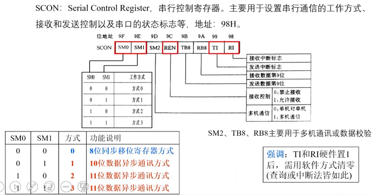 配置SCON寄存器,选择串口的工作模式---通常采用模式1