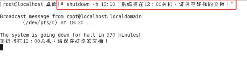#shutdown -h now "关机提示"(立即关机) 或者#sheutdown -h 15:25 "关机提示"(定时关机) - 案例:设置Linux系统关机时间在12:00