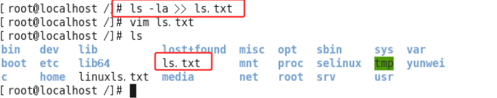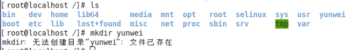 #mkdir yunwei - 注意:ls列出的结果颜色说明,其中蓝色的名称表示文件夹,黑色的表示文件,绿色的其权限为拥有所有权限。
