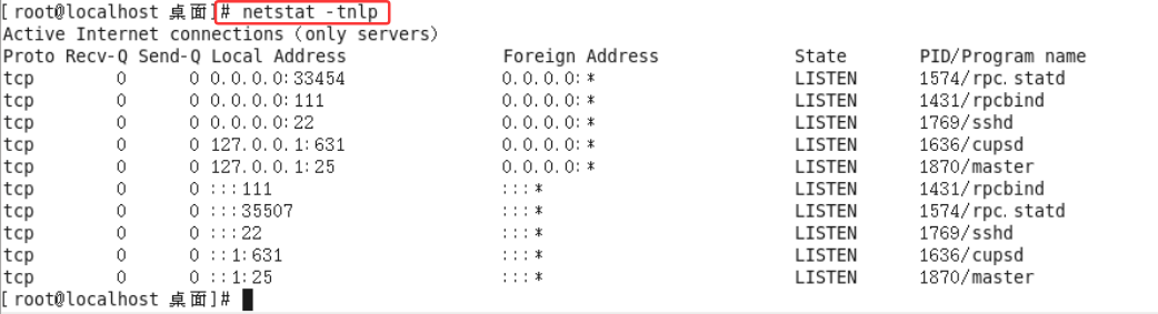 -l:表示过滤出"state(状态)"列中其值为LISTEN(监听)的连接;