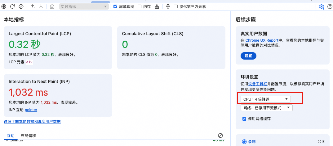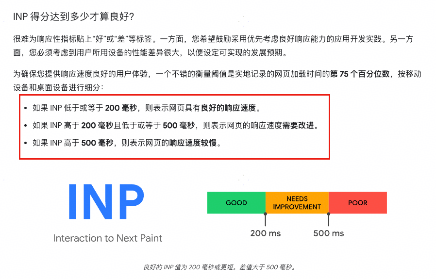 指标:INP。INP的全称叫 Interaction to Next Pain,意思是从交互到下一次绘制的延迟。