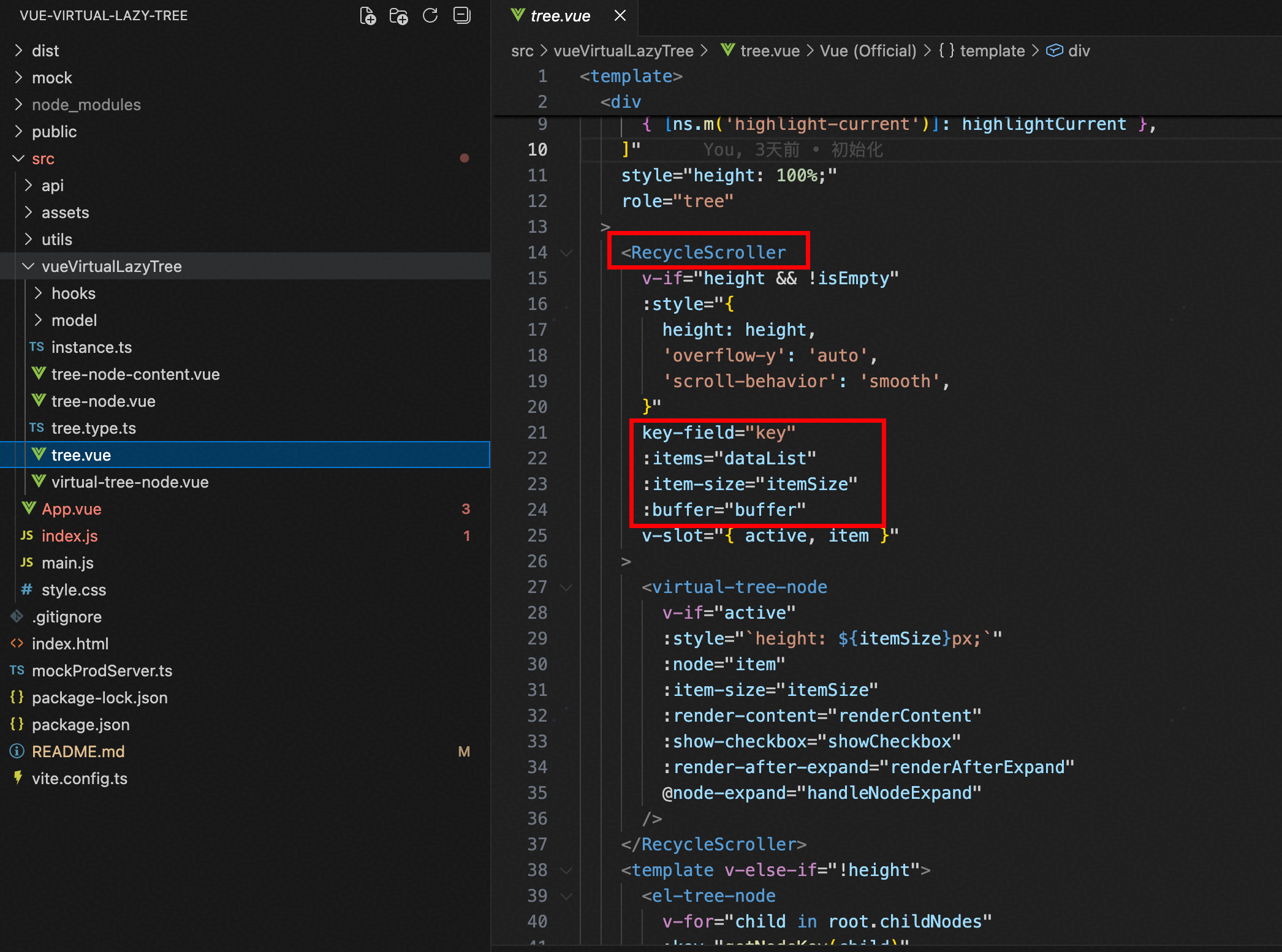 4、在tree.vue中使用,从vue-virtual-scroll中引入RecycleScroller,传入所需要字段,具体字段可参考RecycleScroller官网。