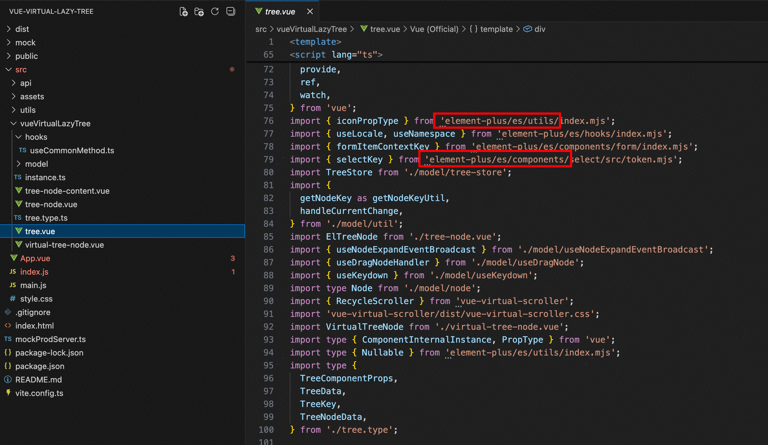 1、在element-plus的github库找到el-tree,copy出所有代码。注意源码里面有些引用是相对路径,需要自己改成绝对路径。如图中红框中,源码中是'../utils/index.mjs',需要手动改成从element-plus中引入。