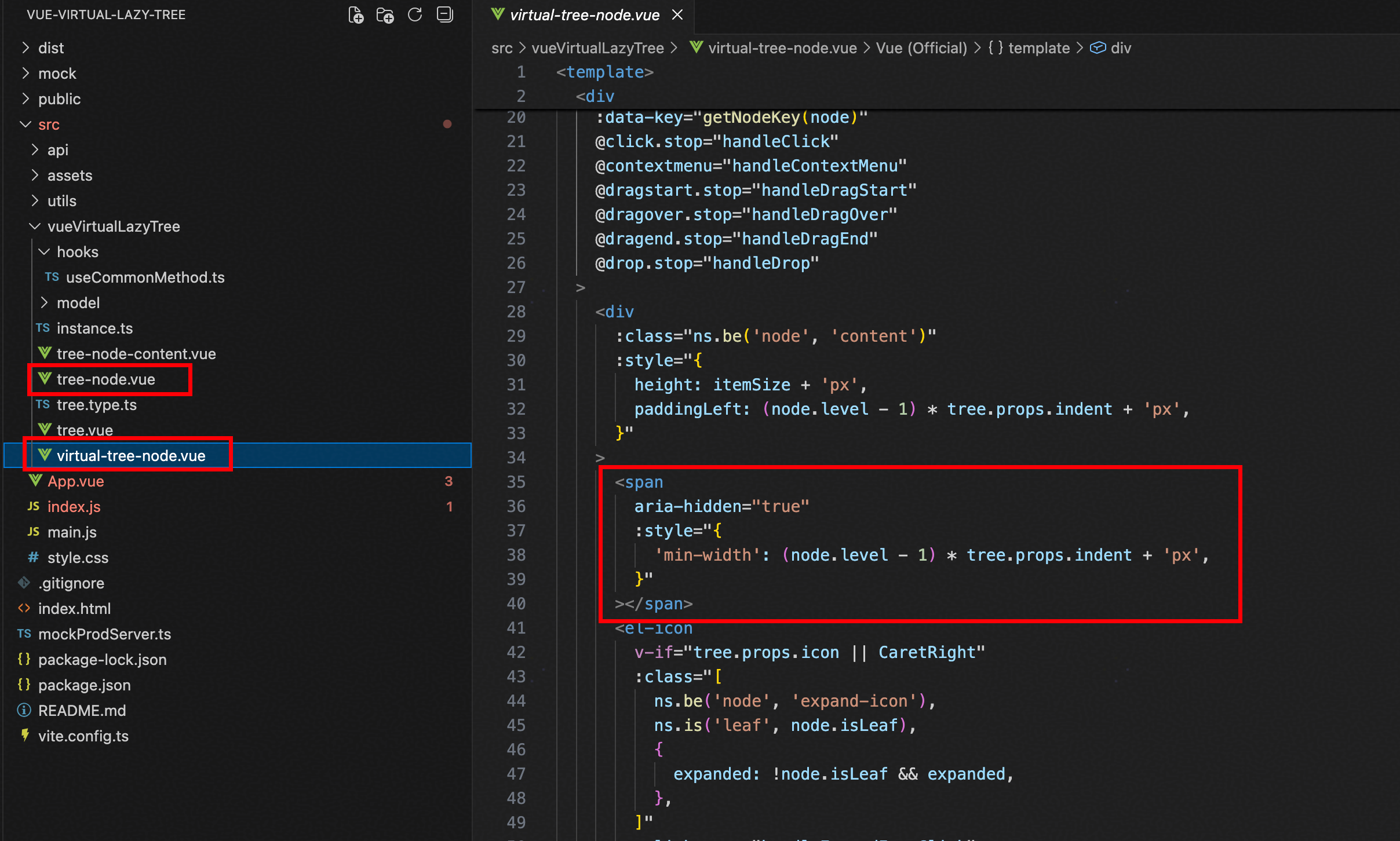 3、将tree-node复制一份,命名为virtual-tree-node,然后删除递归组件,添加span,用来作为树节点前面的空余空间,从视觉上看起来就是一个树。