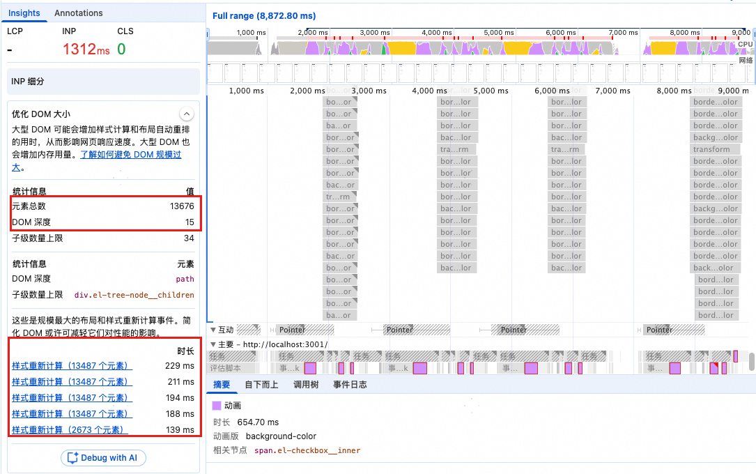 再看图5,浏览器给出的建议"优化DOM大小",此时整个HTML有13676个元素,下面的"样式重新计算"就有13487个元素。