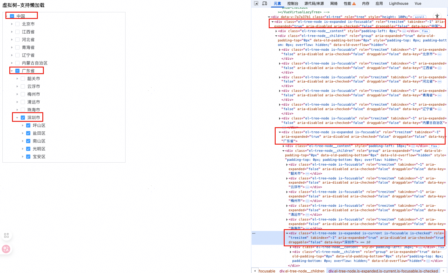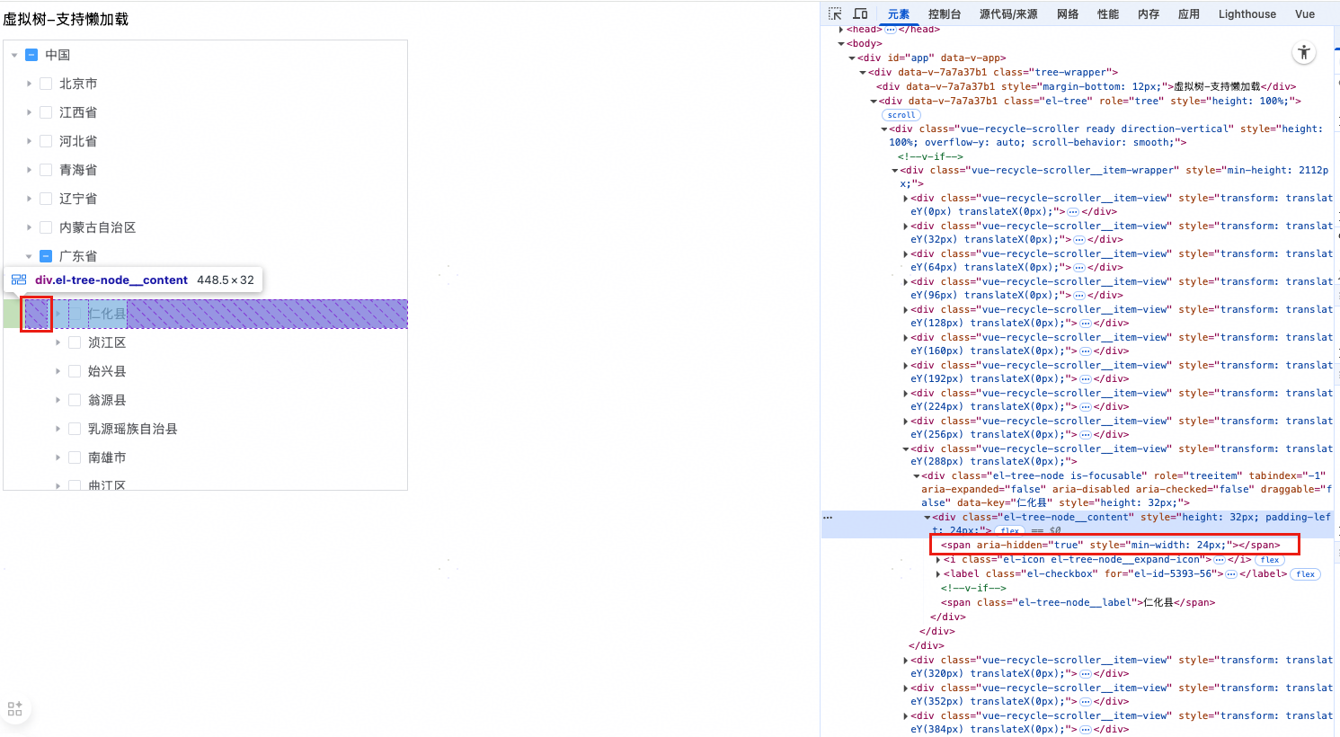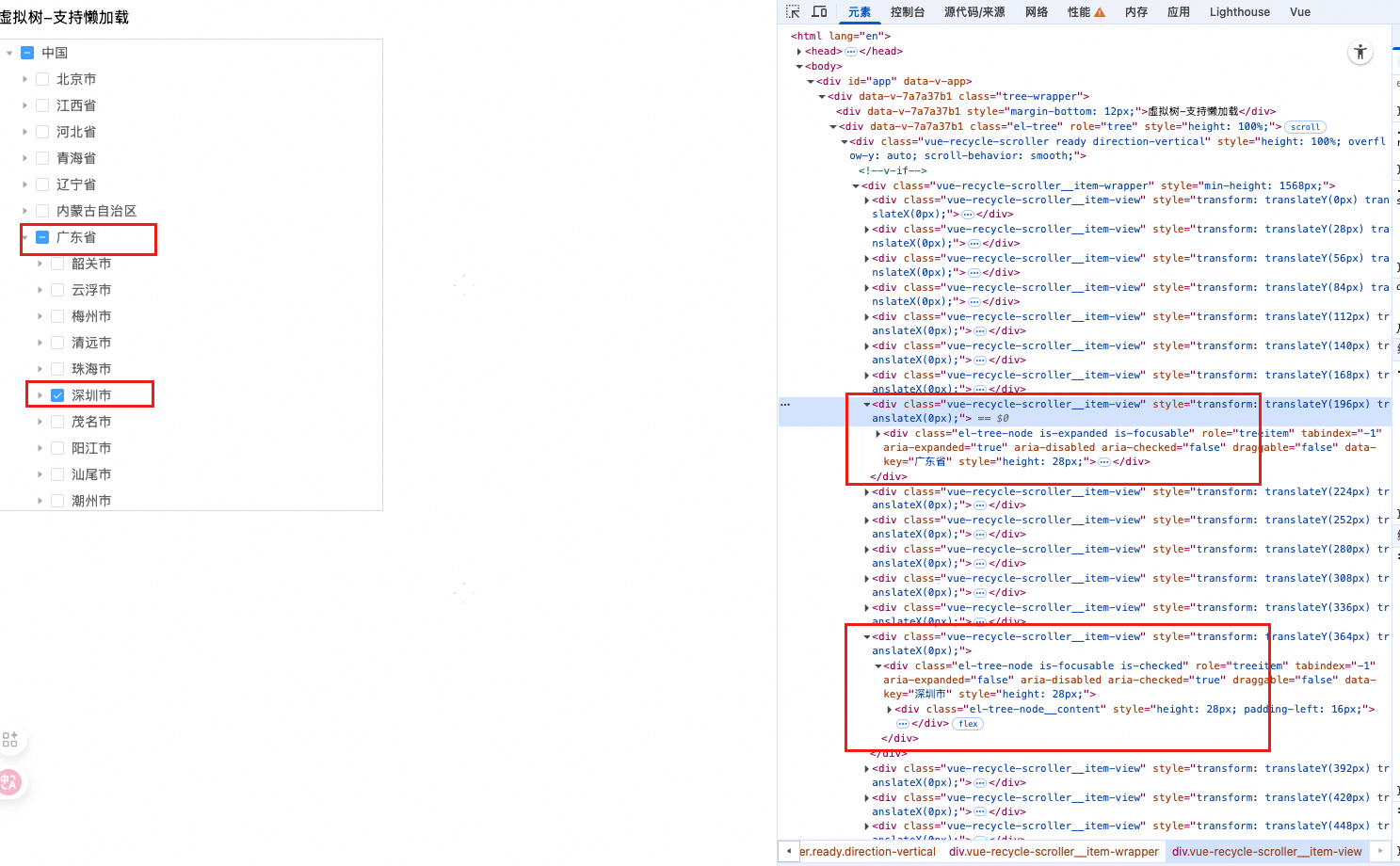 图11为el-tree的DOM,可以看见DOM的层级也是一个树结构,随着DOM节点的增多,会不断递归下去。图12为实现的vue-virtual-lazy-tree的DOM结构,可以看见所有DOM节点都是平铺的,但是从视觉上来看是一个树结构。
