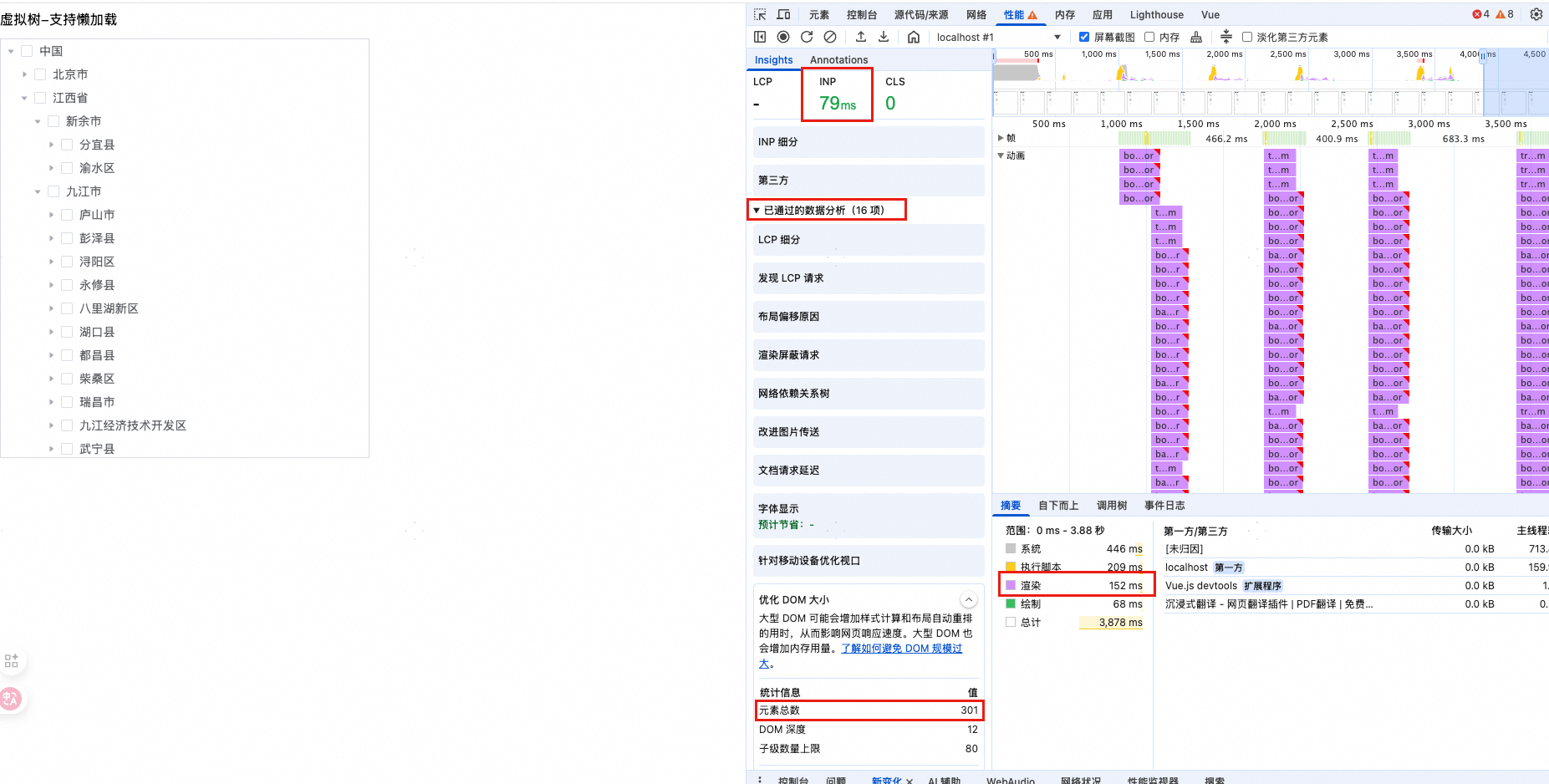 得益于vue-virtual-scroll的功能,就算DOM节点不断增多,vue-virtual-scroll也只会渲染可视范围内的DOM节点,所以始终就只有这几十个DOM节点。从图13可以看出,元素量大幅减少,"优化DOM大小"这一项已被浏览器放到"已通过的数据分析",总体优化后: