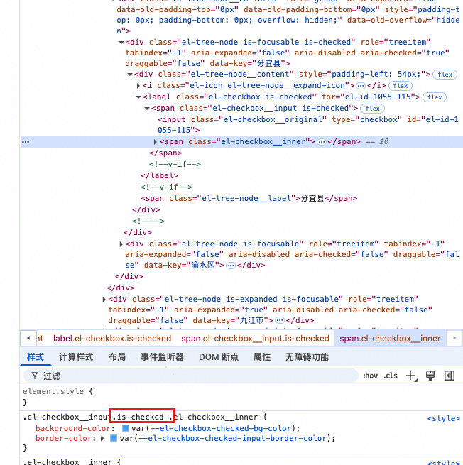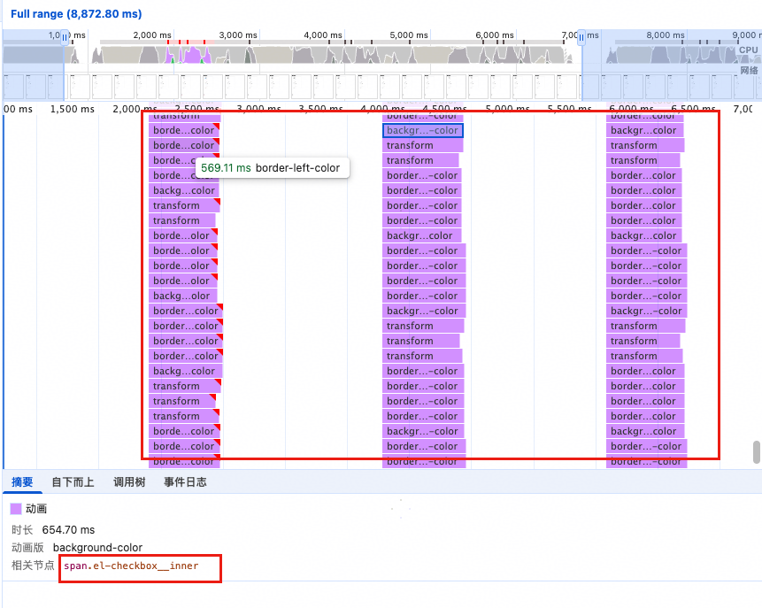 再看图4,有大量的重绘操作作用在el-checkbox__inner上,我们查看html中el-checkbox__inner,可以看见选中的节点中添加了background-color和border-color样式。