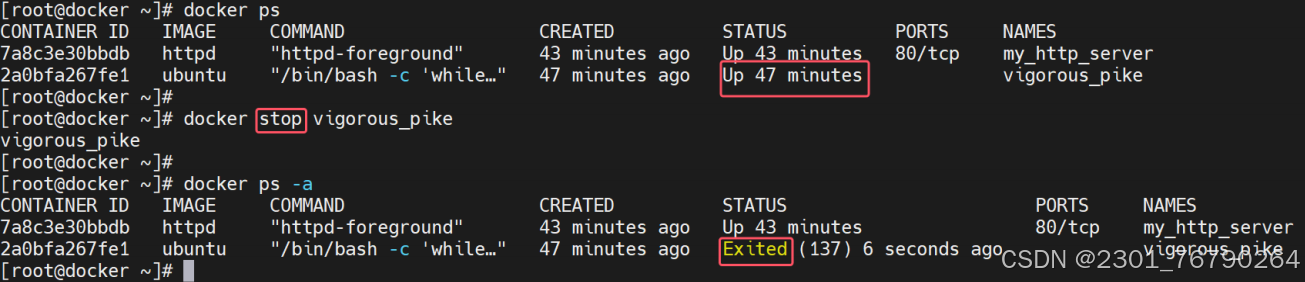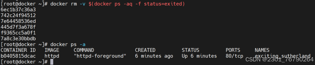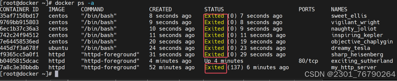 [root@docker ~]# docker ps -a # 容器启动后又退出(无持续运行命令)