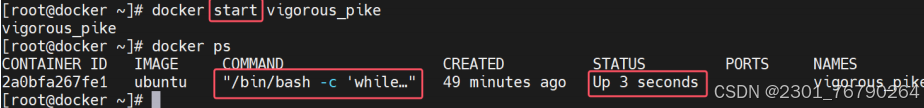 2a0bfa267fe1 ubuntu "/bin/bash -c 'while..." 7 minutes ago Up 7 minutes vigorous_pike
