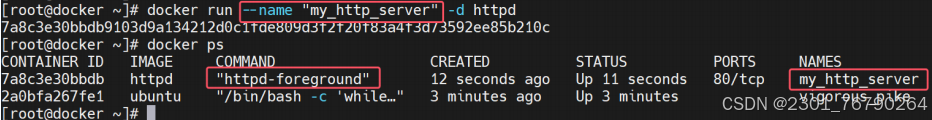 [root@docker ~]# docker run --name "my_http_server" -d httpd