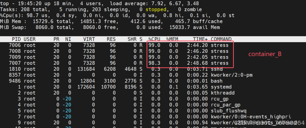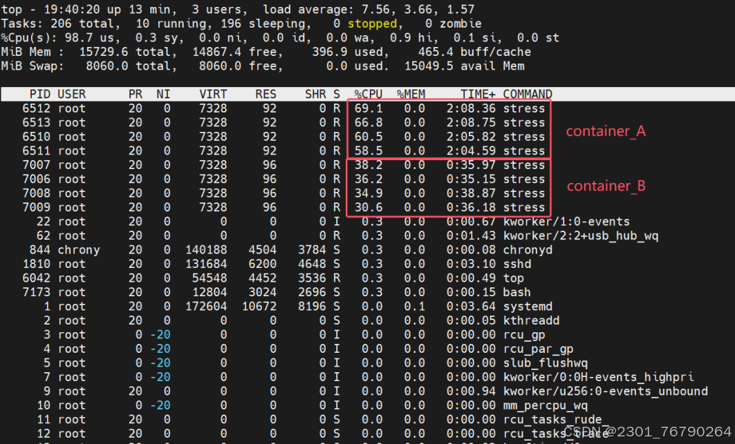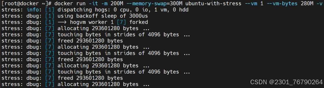 [root@docker ~]# docker run -it --cpu-shares 512 ubuntu-with-stress -c 1 -v