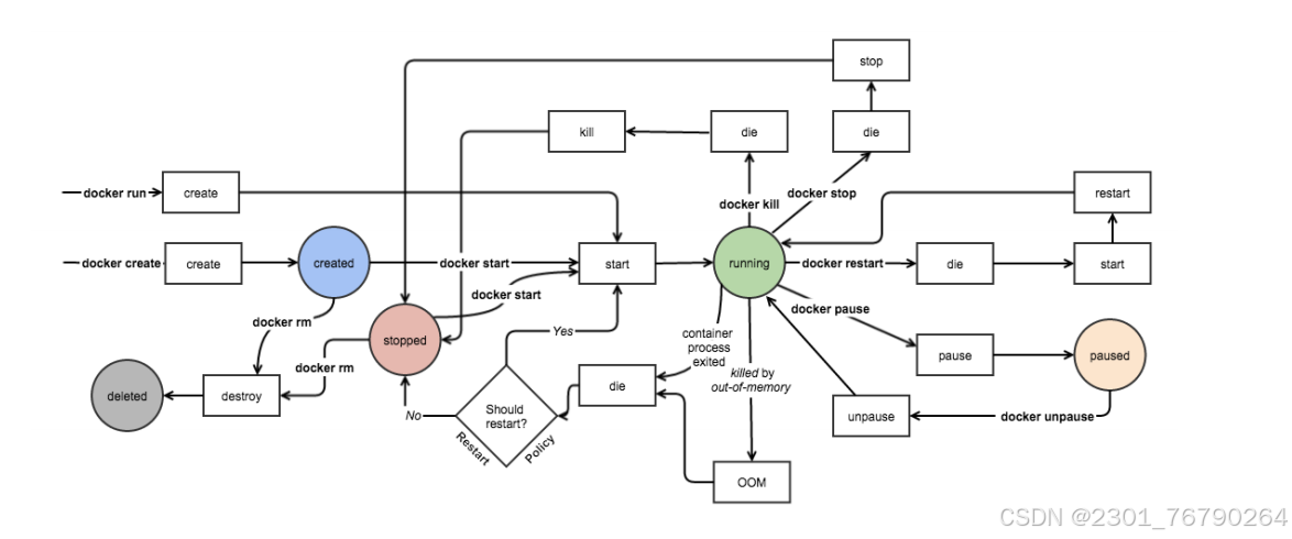 root@docker \~\]# su - gaoqd su: user gaoqd does not exist - cgroup:限制容器对 CPU、内存、IO 等资源的使用量 - namespace:隔离容器的文件系统、网络、PID、用户等资源 - 二者结合实现了容器 "轻量级虚拟化" 的核心特性(高效、隔离) 本章首先通过大量实验学习了容器的各种操作以及容器状态之间如何转换,然后讨论了限制容器使用 CPU、内存和 Block IO 的方法,最后学习了实现容器的底层技术:cgroup 和 namespace。 ### 容器常用操作命令 - create:创建容器 - run:创建并启动容器 - pause:暂停容器 - unpause:恢复容器运行 - stop:发送 SIGTERM 停止容器 - kill:发送 SIGKILL 快速停止容器 - start:启动停止的容器 - restart:重启容器 - attach:attach 到容器启动进程的终端 - exec:在容器中启动新进程(常用 `-it` 进入终端) - logs:查看容器启动进程的日志(`-f` 持续打印) - rm:删除容器