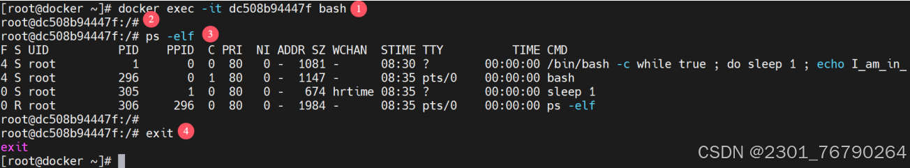 [root@docker ~]# docker exec -it a80f1f8b692c bash root@a80f1f8b692c:/# ps axf PID TTY STAT TIME COMMAND 1 pts/0 Ss 0:00 /bin/bash 17 pts/1 Ss 0:00 bash 25 pts/1 R+ 0:00 \_ ps axf
