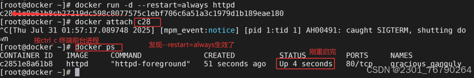 通过 docker attach 可以 attach 到容器启动命令的终端,跟随容器启动命令的输出。
