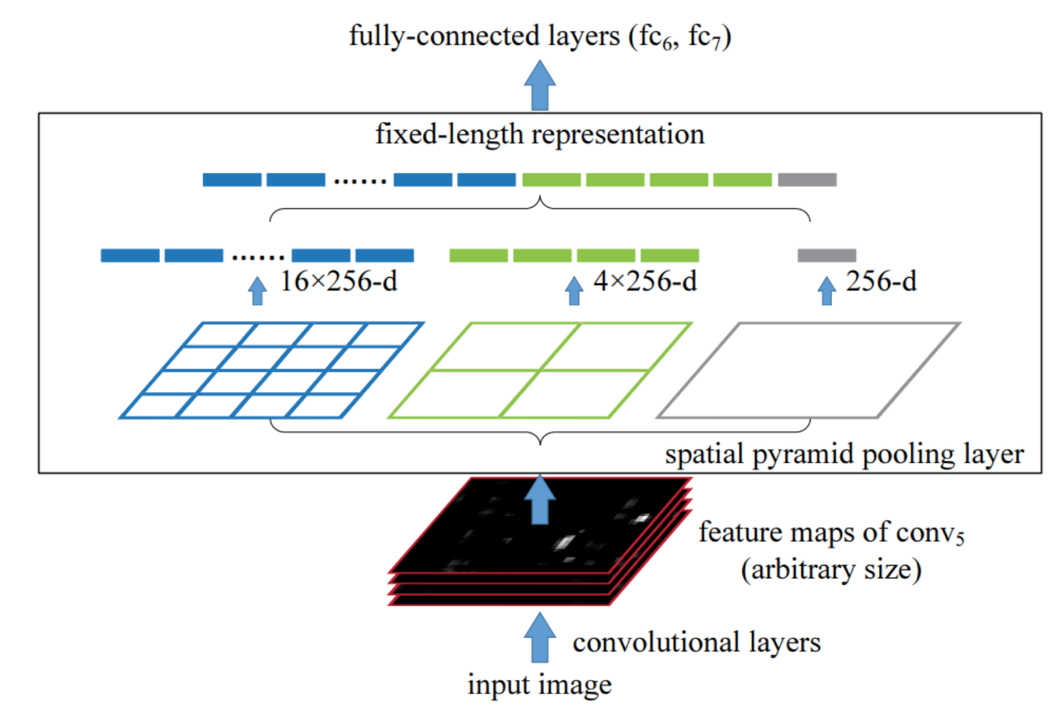 通过spatial pyramid pooling 将任意大小的特征图转换成固定大小的特征向量