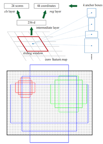 - 低维特征向量输入两个并行连接的1 x 1卷积层然后得出两个部分:reg窗口回归层(用于修正位置)和cls窗口分类层(是否为前景或背景概率)