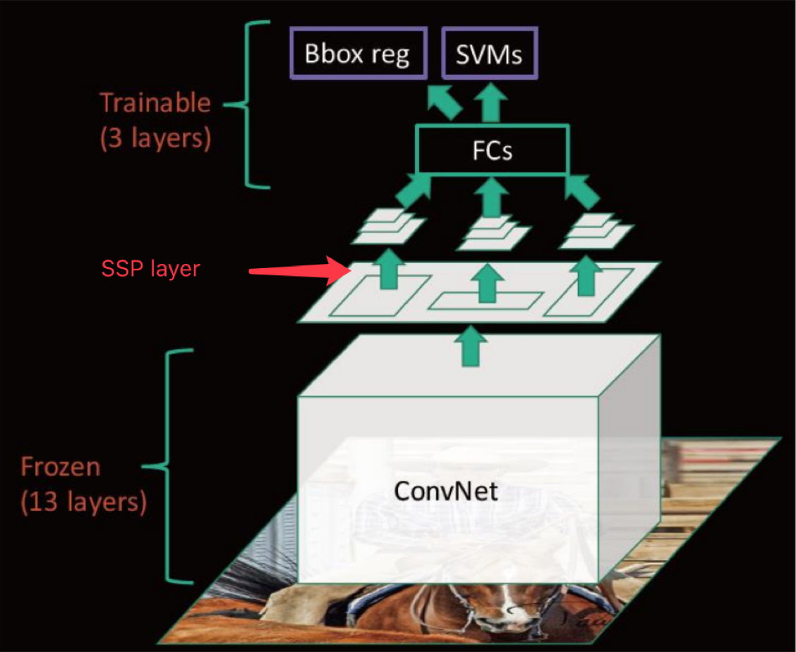 - 分阶段训练网络:选取候选区域、训练CNN、训练SVM、训练bbox回归器, SPP-Net在fine-tuning阶段无法使用反向传播微调SPP-Net前面的Conv层