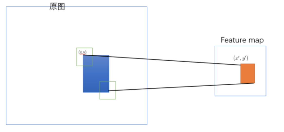 假设(x′,y′)(x′,y′)表示特征图上的坐标点,坐标点(x,y)表示原输入图片上的点,那么它们之间有如下转换关系,这种映射关心与网络结构有关:(x,y)=(S∗x′,S∗y′),即