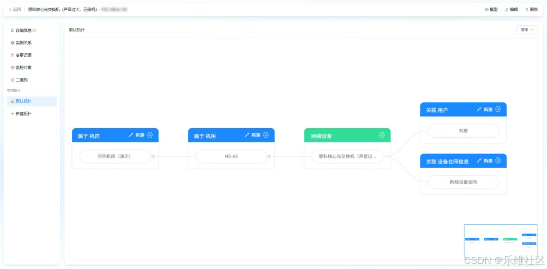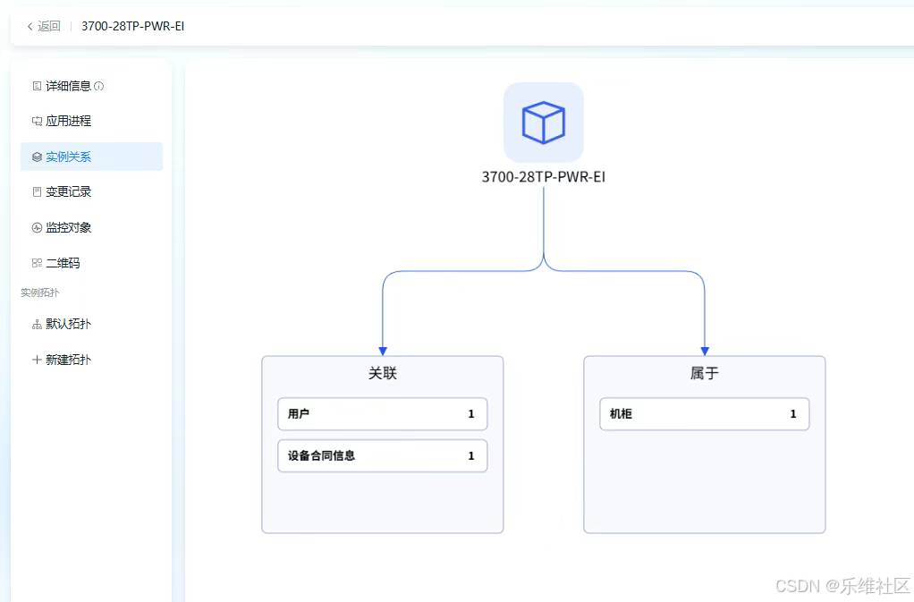实例关系:实例所属机柜、关联用户与设备合同信息