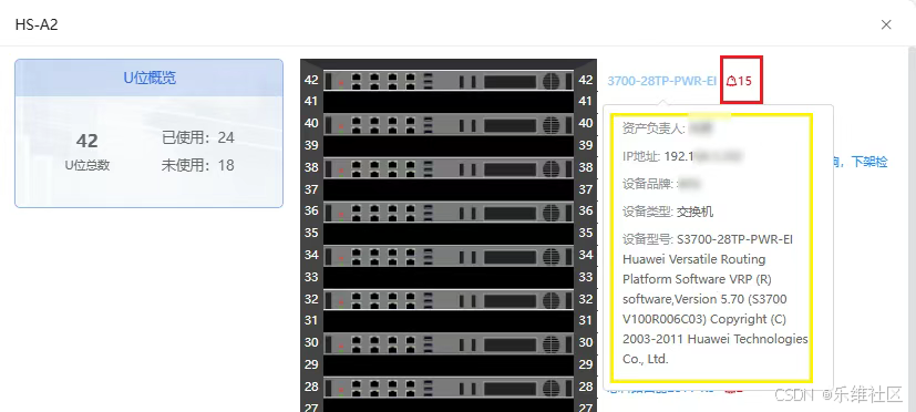 高亮标识告警机柜与资产,精准定位告警位置,同时关联U位信息