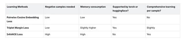 哪种方法最好?要看具体场景、数据量和算力。从我的实验来看,InfoNCE 覆盖面最广。但只要实验做得够充分、训练数据比例调得够细,余弦嵌入损失也能达到差不多的效果。三元组边距损失我没有深入探索,不过它可能是介于另外两者之间的一个折中选项。