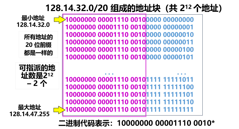 | 128.14.35.7/20 | 是 IP 地址,同时指明了网络前缀为 20 位 该地址是 128.14.32.0/20 地址块中的一个地址 |